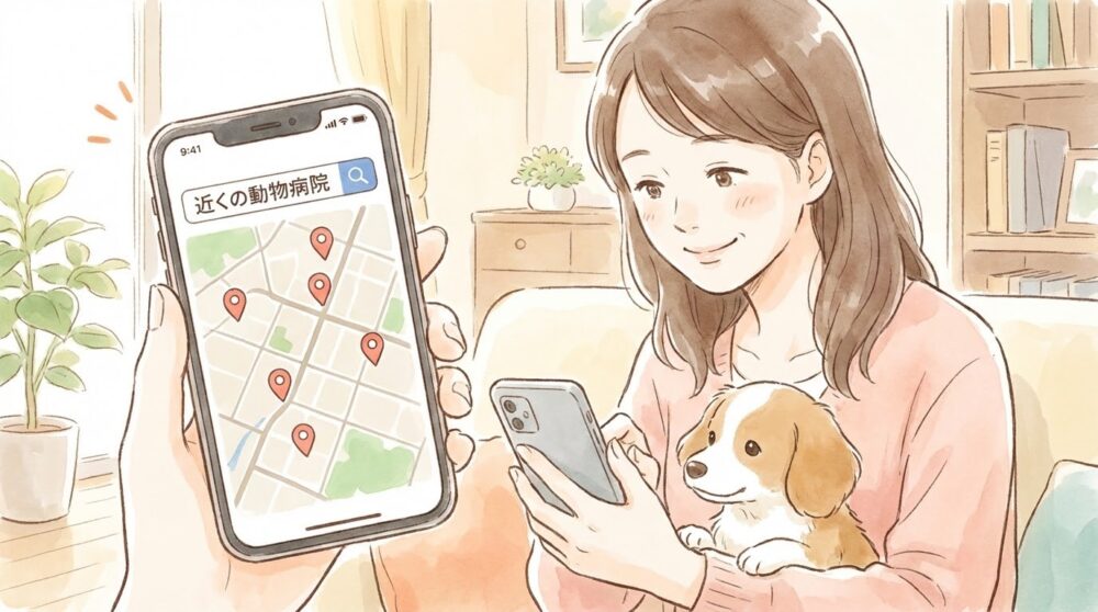 ポケットからスマホを取り出し、「近くの動物病院」と打ち込みます。