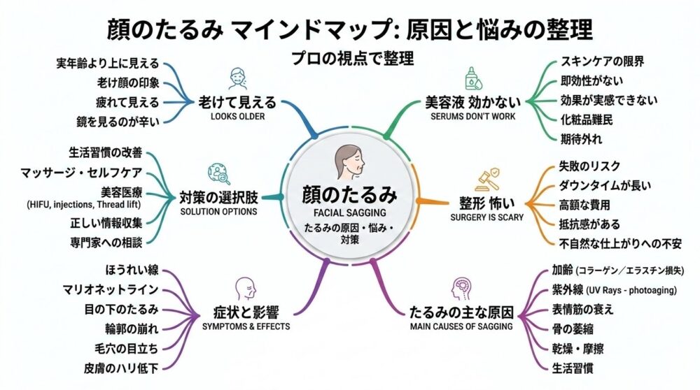 「顔のたるみ」というキーワード一つとっても、「マスクを外すのが怖い」「同窓会に行きたくない」といった、具体的な感情がセットになっています。