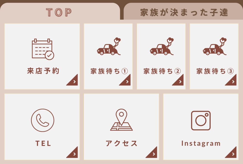 「家族が決まった子達」という名称で売れた自動車もカードメッセージで表示させたいというご要望と売れた自動車が増えていく拡張性を考慮し、LINEリッチメニューは「TOP」と「家族が決まった子達」でタブ切り替えができる仕様にしました。(↑上記画像)